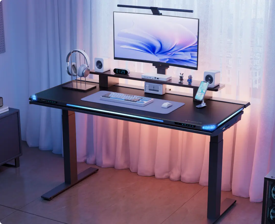 GAMING DESKSBlacklyte Adjustable Standing DeskWith multiple size options available, our Adjustable Standing Desks provide ergonomic comfort and flexibility to suit any Space for a healthier, more productive day. Crafted with the highest quality materials, each desk ensures durability and stability. -